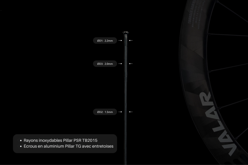 Les roues de la série Valar TH utilisent des rayons Pillar PSR TB2015 triple butted, fabriqués en acier inoxydable T302+ et issus de la technologie Pillar Cold Drawn. Trois diamètres différents sont obtenus dans un seul rayon. Le rayon PSR est quatre fois plus résistant qu’un rayon standard.
