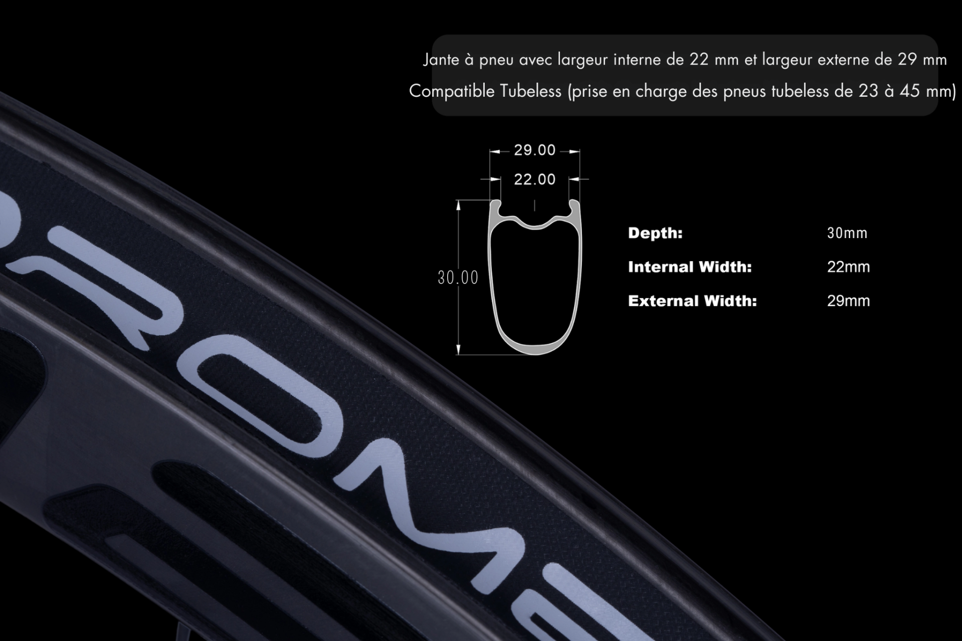 Compatibilité Tubeless – Toutes les roues OROME VALAR sont compatibles tubeless grâce au système de maintien des tringles, aux crochets en carbone renforcés et aux largeurs internes de jante de 19 mm (frein sur jante) et 22 mm (frein à disque).